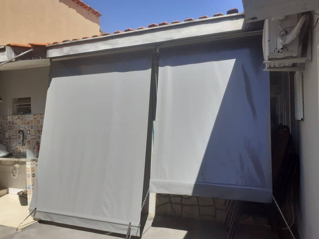 A imagem destaca toldos cortina (tela/rolete) em tom cinza instalados…